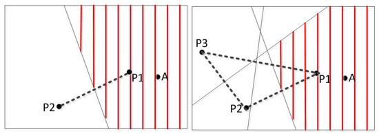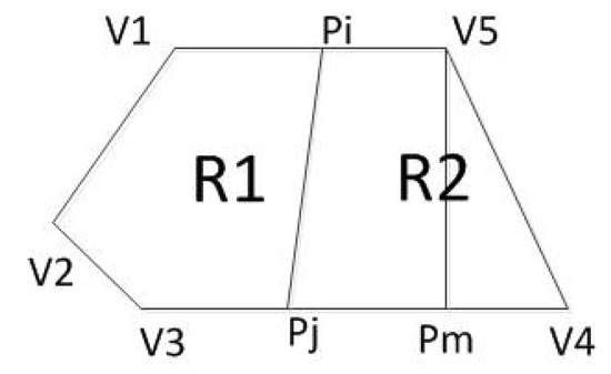 Based on the discussed above, assume that a possible region R of a sensor node calculated previously and its corner point set , as in Figure 2, and an additional vertical line generated by a new charger stop position, where, and are the intersection point of l and the edges which belong to the possible location area R. In this type of positioning algorithms, the center of gravity of the possible location area is taken as the position of the node. The smaller the possible location area is, the more accurate node position will be. In the Figure 2, R is split into two sub-areas and after being split by the intersection line . Since the diameter of the area is positively correlated with the size of the error, the optimal segmentation line is to minimize the diameter of the sub-area to obtain a more accurate node position. Firstly find the point set and , satisfies , satisfies , where is the distance between line and point , and so to . Calculate the distance between each point in the two point sets to all the corner points and find the two points with the smallest sum of the distances. The line connecting the two points is the optimal dividing line. The optimal segmentation line is the mid-perpendicular line of the current charging stop position and the optimal stop position. By this method, a better charging stop position [26] can be found.