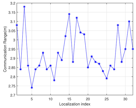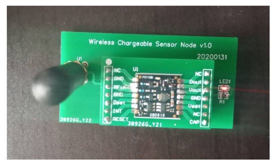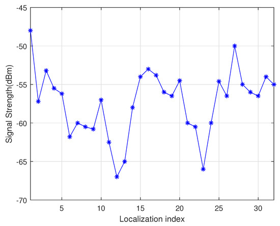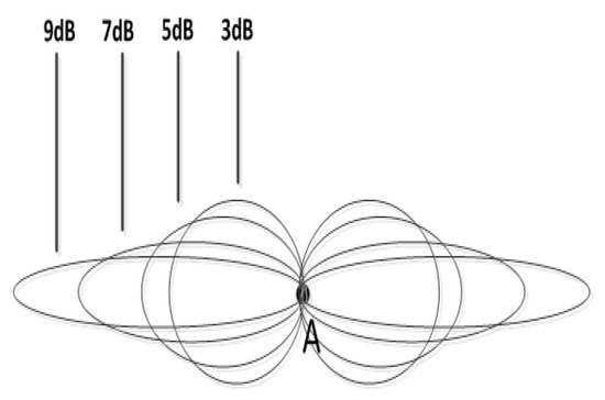 As shown in Figure 3, the point A is the location of the charger, and the four adjacent rings are the communication coverage when the antenna gains are 3 dB, 5 dB, 7 dB and 9 dB, respectively. The size of the gain is inversely proportional to the wireless bandwidth. A typical sensor node uses an omnidirectional antenna below 9 dB, so the communication range is an approximate circle. To verify the above physical characteristics, the experiment uses the self-designed wireless rechargeable sensor node to divide the sensor node-centered direction into 32 parts and measure the communication range of the node in each direction as the Figure 4. The experimental scene is shown in the Figure 5, the wireless charger is the POWERCAST transmitter TX91503 and the sensor node is the self-designed PCB circuit board which has a led status for showing the received energy. The test results are shown in the Figure 6. It can be seen from the experimental results in Figure 6 that the communication range of the sensor node is not a complete circle, but an approximate circle. At the same time, a low antenna gain signal source is set outdoors, with the signal source as the center and the length of 3 m as the radius. The 32 points are measured at equal intervals on the circle, and the signal strengths of 32 positions are measured. The measurement results are shown in Figure 7. As shown in the figure, the signal strengths at different positions are different on the ring at the same distance from the signal source. The intensity of the signal has peaks and troughs, of which the trough is relatively obvious. Around the peak, there are more positions similar to the peak signal strength, but there are fewer similar signal strengths near the trough while the similar signal strengths are fewer near the trough. Since the signal source uses a low-gain antenna, its waveform is shown in Figure 7.