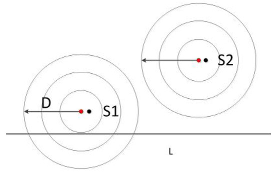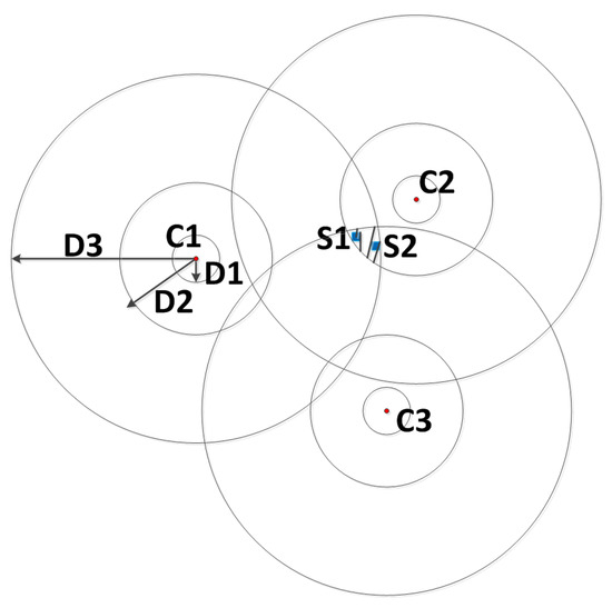 For measuring the effect of a charger’s radiation on the environment, a large number of points should be measured. In order to solve or simplify this problem, when a robot with a charger rotates, the area to be charged by a charger can be divided by a discretization method. It converts the continuous values from 0 to D into a series of values. Suppose a charger covers an area in the range of 0 to D, centered on the location of the charger, using a set of concentric circles , , … divides the radiation area, and the change in energy value between concentric circles is fixed. G means that it is the number of the circles. Correspondingly, the energy of each ring after discretization is labeled as , , … , and for each block is shown in Equation (4), where represents the charger, represents the k areas of the charger and represents the energy value of the area of the charger. For example, in Figure 10, , at this time, the effective charging range of each charger is divided into three parts and the radiation intensity of the positions of the sensor nodes and can be considered to be the same. According to the step of discretization in the Figure 10, the shaded area can be expressed as . The higher the value of G, the more the number of concentric circles and the more accurate the calculation will be, with the higher computational complexity. Therefore, the selection of the G value needs to balance accuracy and time.