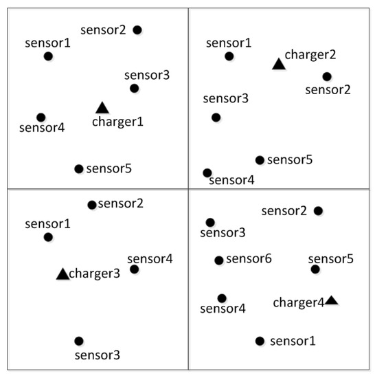 The distribution of the overall area is shown in Figure 12. Each partition describes the charger and the sensors to be charged. Now we need to consider finding an optimal charging algorithm for the entire area comprehensively. In the algorithm for the whole region, obtain the optimal solution of each partition and calculate whether the edge node of the partition has a charging conflict. If the charging conflict occurs in some regions, the second optimal solution of each conflict region will be used instead of the optimal one. The solution is calculated to find the optimal solution that satisfies the overall safety conditions. If it is still impossible to avoid the charging conflict, the latter third optimal solution will be added for testing, until a solution that satisfies the safe condition has been selected.