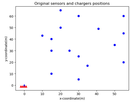 In an overall area, there are N sensor nodes to be charged, M chargers. The nodes that do not need to be charged are independent of the algorithm, so they are not considered for the time being. As shown in the Figure 13, the dot in the figure is the node to be charged and the triangle is the charging node. Each charger is responsible for charging a certain number of sensor nodes and the sensor node should be safely charged before it expires.