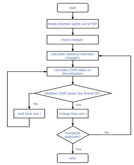 The SCBMC algorithm proposed in this paper includes two steps, as the Algorithm 1. The first step is the MTSP-fixed algorithm for solving the optimal subroute allocation for the chargers. The second one is the charging decision and time consumption calculation step. In details, in the subroute allocation step, we can get the subroute, where in the Figure 15 for example. Therefore, the subroute belongs to the charger for moving later on. There are sensors marked as , where . For simplification of computation, we assume that the waiting time slot and charging time slot is equivalent, both marked as t. The charging decision process should be acted according to the Equations (6) and (7). At last, the total delay time should be the last charger that has completed the subroute moving and charging tasks.