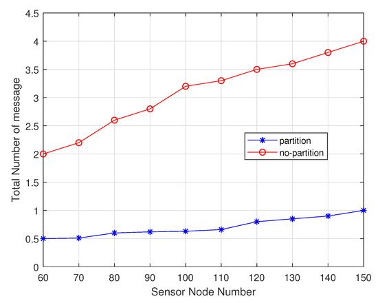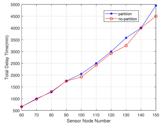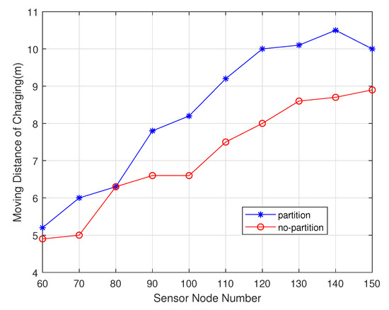 Among these experiments, the sensor nodes number gradually increases from 60 to 150. As shown in the Figure 16, non-partition algorithm can handle it due to the uneven energy consumption in different regions, so its charging delay is lower than the one of the partition algorithm. As shown in the Figure 17, the partition algorithm prefers the charger in this area to the non-partition algorithm, which tends to choose the nearest charging node, so The non-partitioned algorithm moves at a lower distance than the partition algorithm. As shown in the Figure 18, the node with non-partition algorithm needs to communicate with all chargers every charge, while the partition node only needs to communicate with the chargers it is responsible for in its area. The partition algorithm is better than the non-partition algorithm.