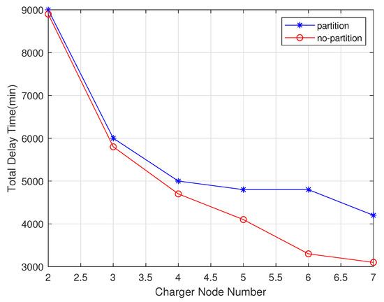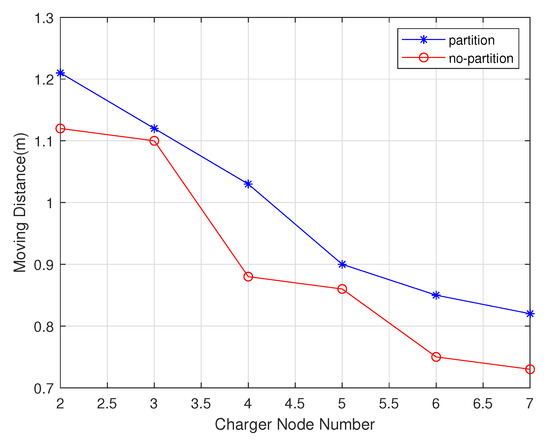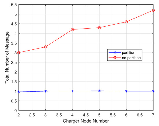In these experiments, the chargers number increased from 2 to 7. As shown in the Figure 19, the number of chargers is negatively correlated with total delay time. The charging delay of the non-partition algorithm is lower than that of the partition algorithm. As shown in the Figure 20, since the partition algorithm will select the charger as much as possible rather than the non-partition algorithm, it will tend to choose the nearest charger, so the moving distance of non-partition algorithm is lower than the partition algorithm. As shown in the Figure 21, since the non-partition algorithm needs to communicate with all chargers for each charging, the partition algorithm is superior to the non-partition algorithm.