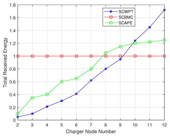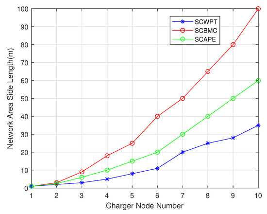The main difference between SCBMC, SCWPT and SCAPE algorithm in the scene include charging methods, mobility and distribution density. The different charging methods make the energy utilization different, calculated according to the Equation (2). Since the SCBMC algorithm selects the sensor node near the charger for charging, charging efficiency is relatively stable. While the SCWPT algorithm has lower charging efficiency when there are fewer nodes in the area. As node number increases, the charging efficiency increases gradually. When there are 10 sensor nodes, the charging efficiency is higher than the SCBMC algorithm. It can be seen that SCWPT is suitable in high density sensor networks. When the density is low, the SCBMC algorithm is more efficient. With the decreasing of the density of sensor nodes, the SCWPT algorithm will face unusable conditions, while the SCBMC algorithm can be used at any node density. From the Figure 22 and Figure 23, as the sensor network area expands, chargers number increases in these algorithms. The growth rate of the SCWPT and SCAPE algorithm is faster than that of the SCBMC algorithm and the number of chargers required in a large-scale network is more. The SCBMC algorithm can cover a larger area because the charger can move, so when the network area increases, the number of required chargers grows slowly.