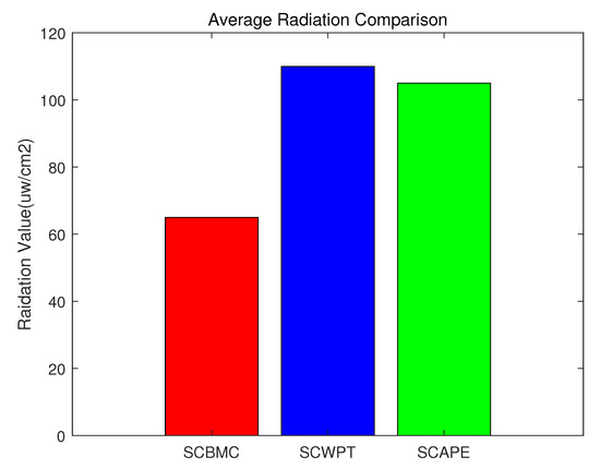 Figure 24 depicts the radiation metric for each algorithm. As we see, the radiation safety level of the SCBMC algorithm outperforms that of the SCWPT algorithm and the SCAPE algorithm. The waiting time slot and charging time are both the same, therefore the average radiation value of the SCBMC algorithm usually equal to half of the EMR threshold. According to the literature of SCWPT and SCAPE, the radiation values of them are just a little bit below the threshold. In details, the radiation value of the SCBMC is 65 W/cm, however, the radiation value of the SCWPT is 110 W/cm and the radiation value of the SCAPE is 105 W/cm. At the same time, ensuring the safety threshold value, the total moving distance of chargers can be kept to a minimum.