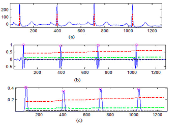 QRS detection (a) pulse train of the QRS on ECG signal (b) QRS on filtered signal (c) QRS on signal and noise level (black), signal level (red) and adaptive threshold (green).