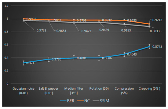 Figure 7 shows the values of BER, NC and SSIM of extracted patient images and embedded images under different image-processing attacks. The values of BER was less than 0.5 in all cases even the values of NC and SSIM are near to one. The values of BER, SSIM and NS confirm the resistance of the image-processing attacks on the extracted watermark. Therefore, from Table 4 and Figure 7 demonstrate the robustness of the presented technique against image-processing attacks (Y-Axis).