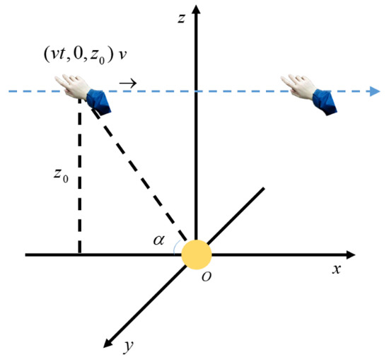 The left-hand coordinate system is established with the ball center as the origin. For the convenience of calculation, let the trajectory of the hand movement be in the XOZ plane and parallel to the x-axis, as shown in Figure 2. Take the time when the hand is on the z-axis as time zero, and the angle between the x-axis and the line passing through the hand and the origin is α.