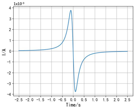 Take in the parameters (set v = 2 m/s, z0 = 0.3 m, Q = −10−9 C, R0 = 0.004 m) to simulate the current i, and the current waveform is shown in Figure 3.