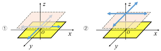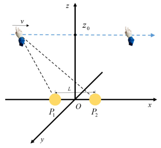 Assume that the trajectory of a hand movement is parallel to the straight line of two electrodes; the distance between them can be calculated based on the values mentioned above. Take the midpoint of the connection of electrodes P1 and P2 as the origin, and the line of two electrodes is the x-axis. Set the trajectory of the hand movement in the XOZ plane and establish the coordinate system as shown in Figure 5. Set the electrode spacing as L.