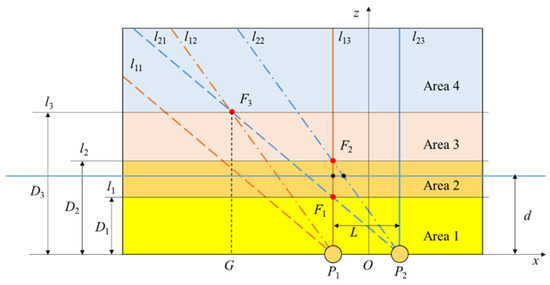 In Figure 6, P1 and P2 are spherical electrodes placed on the x-axis. Make lines l11 and l21 have an angle of α1= 39.2° with the x-axis through P1 and P2. When the hand moves along the x-axis, the trajectory of the hand intersects with l11 and l21 successively, while the maximum values of the change rate of the induced current on P1 and P2 occur successively. Let their occurrence time be T11 and T21. Make lines l12 and l22 have an angle of α2 = 54.7° with the x-axis through P1 and P2. When the hand moves along the x-axis, the trajectory of the hand intersects with l12 and l22 successively, while the maximum values of the induced current on P1 and P2 occur successively. Let their occurrence time be T12 and T22. Make lines l13 and l23 have an angle of α3 = 90° with the x-axis through P1 and P2. When the hand moves along the x-axis, the trajectory of the hand intersects with l13 and l23 successively, while the zero-crossings of the induced current on P1 and P2 occur successively. Let their occurrence time be T13 and T23. F1, F2, and F3 are the intersections of l13 and l21, l13 and l22, and l12 and l21, respectively. l1, l2, and l3 are straight lines passing through F1, F2, and F3 and parallel to the x-axis. Their distances from the x-axis are D1, D2, and D3, respectively.