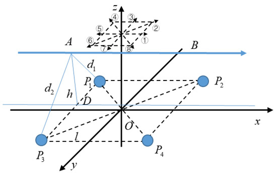 The height of a hand movement can be calculated by making up a planar array of multiple electrodes, that is, the vertical distance between the trajectory of the hand movement and the planar array of electrodes. Using an array of four spherical electrodes, the coordinate system as shown in Figure 7 is established by taking the midpoint of the square with four electrodes as the vertex as the origin. The electrodes P1, P2, P3, and P4 are all in the XOY plane, and the distance of each electrode from the x and y axes is l. The height of the hand movement is the distance h between the trajectory of the hand movement and the XOY plane.