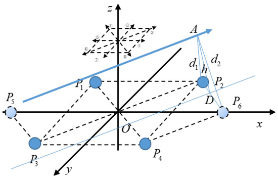 For convenience, the eight directions on the plane are numbered in the order as shown in Figure 7. In most cases, the distance d measured by two electrodes is not equal to the height of the hand movement h. Take direction ① as an example. AB is the trajectory of the hand movement parallel to the x-axis, and AD is perpendicular to point D on P1P3. The length of segment AD is the height of the hand movement h. The distance measured by electrodes P1 and P2 between the trajectory and the straight line P1P2 is d1 and the distance measured by electrodes P3 and P4 between the trajectory and the straight line P3P4 is d2.