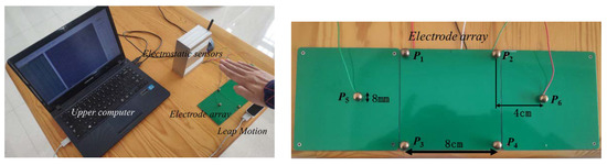 In order to verify the algorithm proposed in this paper, we designed a human hand movement sensing system based on human body electrostatics, including a planar array of four spherical electrodes, electrostatic sensors, and an upper computer. Electrostatic sensors can convert the induced current into voltage signal output, which is convenient for subsequent signal transmission and processing. The response time of the electrostatic sensors is 1~2 milliseconds. The signal collected by the electrostatic sensors is transmitted to the upper computer through a wireless transmission device. The upper computer determines the information of the hand movement through the induced current signals and reflects it on the screen. At the same time, Leap Motion is used as the standard sensing system to verify the accuracy of the human hand movement sensing system, as shown in Figure 11. In practical application scenarios such as vehicle interactions, we think 50–350 mm is the proper operating range. If the hand is too close to the array, it may touch the electrodes. If the distance is too far, it can be considered that the hand exceeds the operation area and we can ignore it as interference.