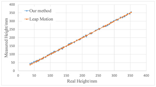 The upper computer calculated the height of the hand movement based on the received signals and compared it with the output values of Leap Motion. A total of 80 groups of data were collected at different heights, and the comparison results are shown in Figure 14.