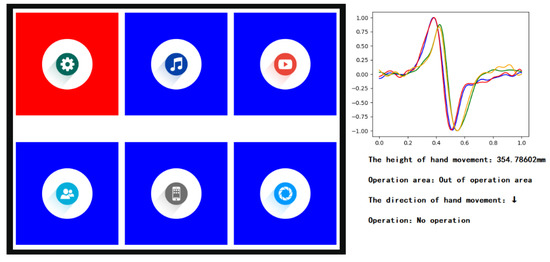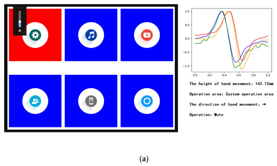 In order to verify the usability of the method proposed in this paper, we wrote a program of a human-computer interface on the PC and obtained gesture information through the electrode array to control it. The area above the electrode array was divided into system operation area and application operation area. The system operation area was the area within 15 cm above the electrode array, and the gestures in this area were operations for controlling the system regardless of the current application, such as mute and standby. The application operation area was the area 15–30 cm above the electrode array, and gestures in this area were operations for controlling the current application or desktop. If the measured height of hand movement was more than 30 cm, it was considered as interference caused by distant charge movement (such as the hand movement of a person far away). The defined gestures are shown in Figure 17.