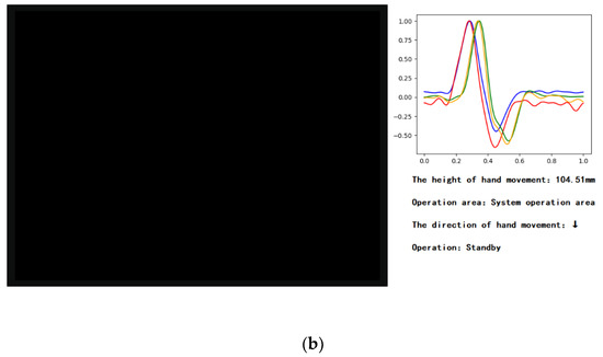The interface reactions when the hand in the system operation area. (a) Waving the hand to the right; (b) waving the hand down.