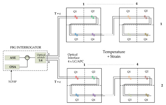 The concept of the developed system is based on two basic elements—the evaluation (interrogation) unit and partial blocks with dimensions of 1 m × 1 m forming the final measurement area. The basic idea was presented in [18]. Each block consists of 4 quadrants, as shown in Figure 1. The partial quadrants contain one measurement element in the case of temperature measurement only or two elements in the case of simultaneous temperature and thrust (mechanical deformation) measurement. The evaluation unit has a 4-physical-channel Lucent connector/angled physical contact (LC/APC) connector, with up to 16 sensor elements per grid, in the case of our FBG grid. The key element here is the optimally spaced spectrum and spectral spacing between the individual sensors so that when their wavelength changes due to variations in the measured quantity, there is no mutual spectral overlap with neighboring sensors. The overall spectral range of the evaluation unit is 40 nm for each physical channel within the C-band range. Table 1 provides a comparison of commercially available units with the units used for measurement and evaluation of the results. As seen from Table 1 the proposed system has parameters comparable to or better than those of commercially available systems. However, the proposed system has no defined dimensions because it will be available in the market in the second half of 2020, which is why these values are not specified. Additionally, Table 1 does not contain the price because it is defined customer by customer according to their requirements.