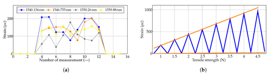 Experimental testing with a load of 6 kg was performed to verify the behavior of all 4 strain sensor elements implemented in textiles under load. Figure 3a) shows the graph for when a 6 kg-weight load was placed randomly around the FBG elements. As seen from the graph, the strain changes caused by the load are not constant. The most important parts are at the beginning and the end of the measurement, where it can be seen that the fabric returns to its original state when no load is applied. Figure 3b) shows a precise measurement of the strain caused by uneven tensile action on the textile block. There is a linear dependence of the strain on the tensile stress and a slight deformation of the fabric when relieving the tension. This deformation causes a measurement error of approximately 3 %. As seen in Figure 3 until 4 N, the relation is almost linear. However, for higher forces, the dependence is not linear. The aim of the measurement was to verify the functionality of the textile block. The measurement error was determined based on the deformation of the textile block when relieving the tension. In other words, when a 4.5 N force was applied, the reference value (zero point) changed by approximately 3 %. In these measurements, temperature elements were not implemented in the fabric, but to eliminate temperature error, another FBG that was not affected by strain was used for temperature measurement.