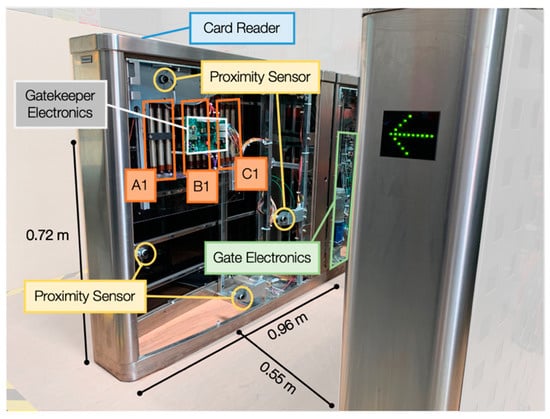 The system selected for embedded detector integration as part of this work was the Gunnebo Ltd. SpeedStile™, part of the Speed Gate™ entrance control portfolio of products. As a product, it is widely deployed globally to provide access control within buildings, airports, transport hubs and at other secure key infrastructure locations. While a number of variants on the product exist, the underlying system components remain largely consistent between models: comprising two parallel (waist-height, 0.95 m tall) units through which a pedestrian user passes as they travel towards the system’s moving gates, which subsequently grant access upon verification from the unit’s integrated card reader (or other identification platform) linked to a central database through a controller area network (CAN) bus. A labelled photograph of the Speed Gate™, with the internal side panels removed, is shown in Figure 1, with a more detailed schematic shown in Figure S1. To prevent against the “tailgating” of one user by another as they transit through the system, the Speed Gate™ is installed with a number of infra-red (IR) proximity (movement) sensors, as shown in Figure 1, to alert the system to likely incursions and consequently deny all entry. As can be observed from the image of the internal workings of Speed Gate™, the majority of the system is comprised of empty space, suitable for detector integration.