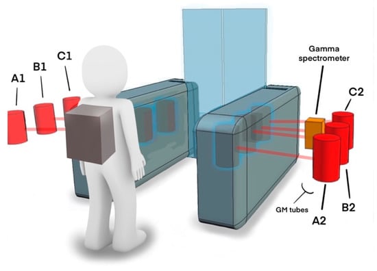 Schematic of the Project Gatekeeper portal system, illustrating the locations of the six distributed Geiger–Muller (GM) detectors (“A1, A2, B1, B2, C1, C2”) and the solid-state miniaturised gamma spectrometer.