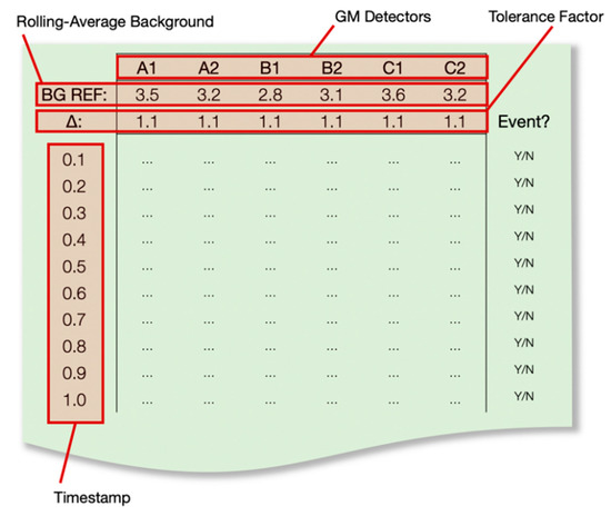 The detection algorithm is initiated in each instance by the identification of passing movement by the directly opposing IR proximity sensors at the entrance to the barrier, identified in Figure 1 (and also in the detailed schematic of Figure S1). At this time, the writing of CPS/10 radiation intensity values to the rolling average buffer is paused such that potentially elevated counts do not serve to influence the background rolling average value. Utilising the continually rolling timestamp provided by the pyboard’s in-built clock, the radiation intensity (CPS/10) recorded (at the standard 10 Hz frequency) by each of the six GM detectors is logged to a matrix array alongside (i) the time (in seconds) since the proximity trigger event, (ii) the rolling average (background) value derived for each of the GM modules and (iii) the aforementioned sensitivity threshold/source tolerance, herein termed “tolerance factor” (or Δ)—a multiplication factor applied to each of the background values to define the maximum/trigger value. A schematic of this output matrix is shown in Figure 4. This “tolerance factor” (Δ) can be modified to adjust the triggering sensitivity of the Gatekeeper system, appropriate where (i) considerable environmental variability may exist (a potential consequence of the high intrinsic background from certain construction materials, although this is largely removed through the rolling background functions), and (ii) the frequency of “false positives” may be too great and a facility may therefore wish to suppress this rate, albeit with an increased security risk. However, following testing and the determination of the rate of false positive occurrences, a 10% (Δ = 1.1) “threshold factor” has been shown to represent the ideal value through which to consistently detect even low activity sources while not simultaneously yielding a significant number of detrimental “false positive” events that require human intervention/investigation.