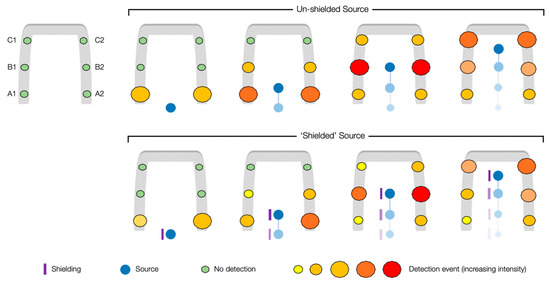 The radioactive source localisation capability is possible as a consequence of the time-integrated variation in detector responses (intensities) to a source at differing (constantly changing) positions within the Speed Gate™, as measured by the array of GM detectors. A graphical representation of this difference in detected radiation intensity by the enclosing sensors of the portal is shown in Figure 5, for both an unshielded and directionally shielded gamma-emitting radioactive source. From earlier work to quantify the influence of biological shielding induced by the human body, it has been established that circa 30% of (Cs-137) gamma radiation is attenuated as a consequence of its interaction with the large volume of strongly attenuating water that comprises the bulk of the human body [21]. Consequently, for a source entering the Gatekeeper-embedded portal concealed on the side of a person, a disparity of up to circa 30% between opposing (A1 and A2, B1 and B2 or C1 and C2) detectors is experienced over a scenario where the radioactive material is unshielded during its path through the Speed Gate™. Hence, through knowledge of the velocity of a person/source progressing through the system (at 1 m/s), the typical detection/trigger response to such a source, and the influence of bodily attenuation yielding an “asymmetrical” detector response, a relative (albeit approximate) source position can be ascribed. As discussed subsequently and corroborated as part of the testing and validation of the Gatekeeper system, such an “emitter localisation” capability is applicable to scenarios where the radioactive source is not only carried within the confines of the entrance control system (i.e., <0.95 m from the ground) on the pedestrian (e.g., within trouser pockets) but also when carried higher from the ground by the pedestrian, above the Speed Gate™ enclosure (e.g., within a jacket pocket, or more likely, inside of a backpack). This is a consequence of the similar gamma radiation “ray” paths and their track to the detectors in the array—whether unimpeded or having sustained some bodily attenuation.