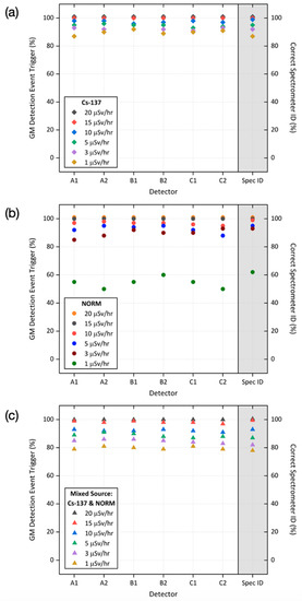 As shown in Figure 6a, for the Cs-137 sources, both the highest dose-rate (activity) material can be detected by all six GM devices 100% of the time and similarly spectrally identified in all instances. For all other Cs-137 sources (1, 3, 5 and 10 μSv/h), they could be detected by all six GM detectors in greater than 85% of the occurrences. However, no situation existed where the presence of the source was not sensed by at least two of the GM detectors to result in a positive trigger and progression of the algorithm. The gamma-ray spectrometer and associated channel analysis algorithm was capable of “fingerprinting” the radionuclide within the currently permissible 1 s analysis time in greater than 84% of instances (better for higher-activity sources). A greater counting time would, however, yield better counting statistics (increased signal to noise) from which to base the source identification.