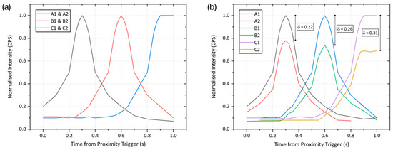 In contrast to the strongly symmetric peaks evidenced by the progression of an “unshielded” source through the detector array, as shown in Figure 7a, the comparable movement (at 1 m/s) of a “shielded” source carried on the left hand side of a person through the gate produces significantly different results, as shown in Figure 7b. Unlike the former plot, where identical radiation intensities were obtained by both detectors in each pair, differences (δ) between the opposing detectors varied between 22% and 31%, a consequence of the significant shielding contribution introduced by the person and which aligns with the previously invoked reduction owing to bodily attenuation [21]. By advancing the “unshielded” source scenario, it is such a time-resolved disparity between the opposing detectors that permits for real-time radioactive source localisation during its transit through the Speed Gate™, embedded with the Gatekeeper system.