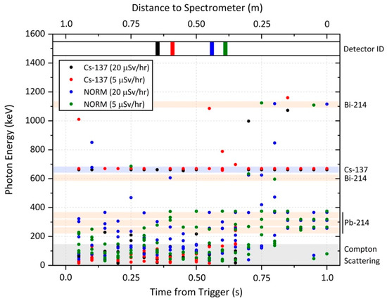 Over the standard 1 s counting period from the “time from trigger” (with GM triggering of the spectral identification algorithm occurring as the source enters the Speed Gate™ and with the source travelling through the Speed Gate μSv/h at the typical 1 m/s), Figure 8 details the individual photon responses (herein converted to photon energy, in keV) with time and transit. As can be seen for the two Cs-137 sources (5 μSv/h and 20 μSv/h) in Figure 8, detection events occur within the designated channels immediately after the detector is activated, with event (channel) frequency further increasing, alongside the signal to spectral noise improving over the duration of the measurement period. This high count rate enables a rapid “detector ID” of the radionuclide (defined as 10% of the total counts within the designated window), shown by the bars at the top of the plot, with the 20 μSv/h Cs-137 source identified within 0.35 s and the 5 μSv/h Cs-137 source spectrally classified within 0.40 s of the detector initialising. A similar, albeit marginally smaller, increase in the windowed count rate/event frequency is observed for both the 5 μSv/h and 20 μSv/h NORM sources, as shown in Figure 8. While the highlighted windows do not show a high incidence of counts following the gamma-ray spectrometers initiation (at “time from trigger” = 0), the number of detection events within these windows rapidly increases until a radioisotope identification is possible. The higher dose-rate 20 μSv/h NORM source was successfully identified in an average time of 0.56 s, with the 5 μSv/h NORM source recognised in 0.6 s from the spectrometer measurement commencement. This slight delay in provenancing the NORM sources in comparison with the Cs-137 is a result of the single monoenergetic emission from Cs in contrast to the multiple photopeaks arising from the NORM material—many of which occur on the shoulder of the Compton edge or at high energies where the inherent detector efficiency is reduced.