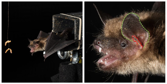 Eptesicus fuscus bat. Left panel: Bats are trained to perch on a platform and produce echolocation calls to track and intercept approaching targets (mealworms). This experimental setup allows us to study bat sonar tracking behavior while maintaining careful control of the target motion. Right panel: Closeup of the head of the bat, showing details of the external ear anatomy. A green dashed line delineates the left pinna, which acts as a receiver and can be independently moved to control inter-aural differences, necessary for azimuthal localization of targets [24]. The red dashed line delineates the enlarged tragus, which contributes to target elevation estimation. Photos courtesy of Dr. Brock Fenton.