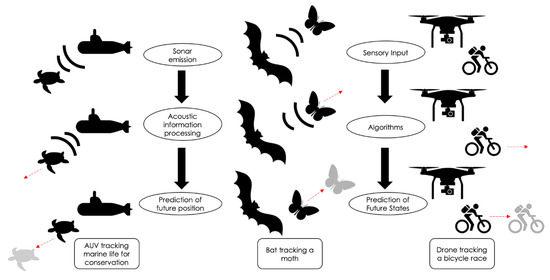 Bats as a biological model to inspire tracking algorithms. Tracking moving targets requires sensory information that can be in the form of echoes (left/center panels) or visual stimuli (right panel). This information must then be processed by computations that allow for the prediction of future states (shown in gray). Man-made systems like Autonomous Underwater Vehicles (AUV) use sonar to track different moving targets, such as marine life and wildlife (left panel). Bats acquire discrete sensory information in the form of echo returns from adaptive sonar emissions; echo snapshots are integrated, to enable the prediction of the future position of a moving insect (center panel). These predictive tracking algorithms can be implemented in technologies that use sonar or other sensory modalities, such as drone videography of a bicycle race (right panel).
