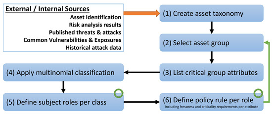 Figure 1 depicts the process that the proposed mechanism uses during the initialization phase, in order to classify the assets, establish permissible subject roles and define the necessary policies per role so as to regulate access. In the defined process, steps 2, 5 and 6 are cyclical in order to ensure policy completeness, as described below in detail.