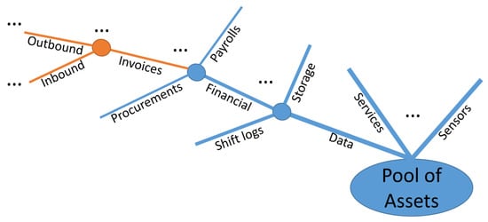 Mechanism—-step 2: Select Asset Group: Step 2 is the first cyclical process, where branches and individuals belonging to specific classes require policy separation from their parent nodes. This separation relies on the initial inputs from external/internal sources but also on operational conditions affecting the required policy granularity. Figure 2 depicts a possible asset taxonomy that can be created within an organization, including but not limited to data, services, sensors, etc. Following the branch related to the data, the separation of policies can be enforced at the level of (i) Inbound/Outbound Invoices; (ii) Financial documents; or (iii) Overall Data, defining and applying the same access control policies for the individuals belonging to the selected class and all their children nodes. The process is cyclical so that all the children nodes have been selected and suitable policies have been specified, ensuring completeness in this way.