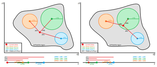 Hence, the Current Value Matrices corresponding to the two subjects are respectively C V A = [ 5 , 5 , 4 , 1 ] and C V B = [ 6 , 8 , 4 , 7 ] . The same normalization technique and the same weights are applied also to these matrices as denoted in Equation (4). Having identified and constructed the required matrices, through Equation (7) we calculate the Euclidean Distance of each alternative from the Weighted Current Value Matrix. The outcome of this calculation is depicted by a matrix S = [ d 1 , d 2 , d 3 ] where d x element represents the distance of the x alternative from the CV. For the given example the distance matrices are S A = [ 0.02 , 0.07 , 0.11 ] and S B = [ 0.06 , 0.03 , 0.10 ] .