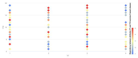 Mechanism—step 3: List Critical Group Attributes: In step 3, the security administrator creates each asset as an individual within the defined classes and lists its critical attributes by defining axioms that establish its type, relationships and object/data properties. This is established within the aforementioned taxonomy but can be graphically represented (or also constructed depending on the system complexity) as presented in Table 1, where F( X k , Y n ) indicates the correlation among the asset and its attributes and the example presented in Table 2. For the purpose of this example, the chosen asset group is the invoices which belong to the financial data of a company. Each of the assets has a unique identifier and is associated with a number of attributes. Furthermore, each attribute can acquire a value within a specified range and is associated with a certain level of criticality. For example, we can assign a high level of criticality to the classification attribute and a low-level criticality to the region attribute.