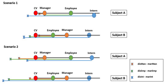 Regarding the first scenario, for Subject A the role which presents a negative difference is the one of the Intern while for Subject B both the role of the Employee and of the Intern. In this case, the smallest distance belongs to the role of the Employee, and thus it will be evaluated first. Since the difference is smaller than zero, this is the role assigned to the subject. The same occurs for the second scenario for Subject A where one can observe that all roles present a negative difference. In this case, because in the distance matrix S A the role of the manager has the smallest distance, it will be evaluated first by the algorithm. Hence, the role of Manager will be assigned to the subject. Accordingly, for Subject B the first role to be evaluated based on the S B is the one of Employee, which presents a negative difference and thus will be assigned to the subject.