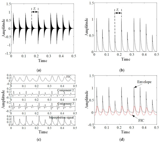 Simulation for pre-processing operations: (a) simulated signal; (b) envelope of simulated signal; (c) signal components decomposed by variational mode decomposition (VMD) and their superposition; (d) envelop and failure-induced component (FIC).