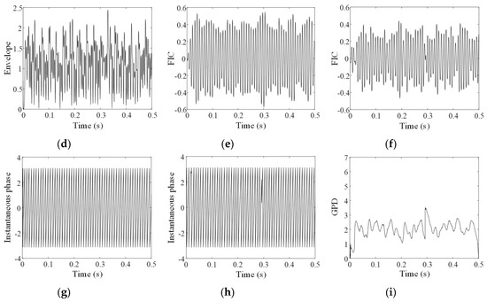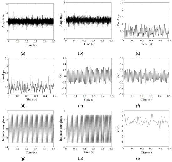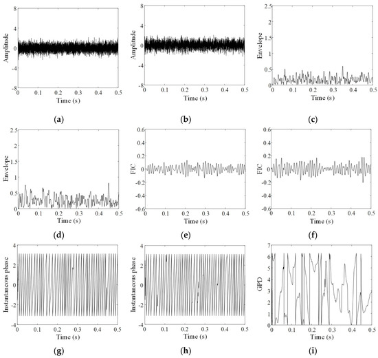 To present the intermediate results of each step in the proposed method, the analyses of the three groups of data, respectively acquired at the 60th, 90th, and 120th minutes, are given in Figure 4, Figure 5 and Figure 6. In these figures, a and b respectively show original signals in horizontal and vertical directions; c and d display the envelopes of original signals obtained by resonance demodulation, while e and f exhibit the FICs separated from the envelope, g and h provide the instantaneous phases of the FICs, and i gives the GPD between two instantaneous phases of horizontal and vertical signals.