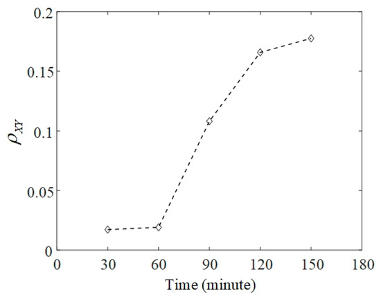To track the failure evolution, vibration signals were selected from the Bearing 1_3 dataset every 30 min to calculate the phase synchronization indicator between horizontal and vertical signals. This indicator is denoted as , and the curve of is portrayed in Figure 7. At the 30th and 60th minutes, values are 0.017 and 0.019, respectively. It means that there is almost no synchronization phenomenon at the early stage of the experiment. Corresponding to the signals at the 90th minute, quickly increases to 0.108. A stable phase-locking relationship was established between horizontal and vertical signals at this moment. This can be observed in Figure 5i. As the experiment time increased, reached 0.166 and 0.178, respectively, at the 120th and 150th minutes. Finally, failure at the outer race was confirmed at the 158th minute. This result verified that the indicator of phase synchronization could satisfy the demand for quantitative assessment of failure evolution in bearings.