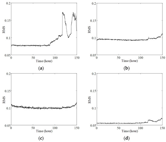 Root mean square (RMS) of vibration signals: (a) bearing 1; (b) bearing 2; (c) bearing 3; (d) bearing 4.
