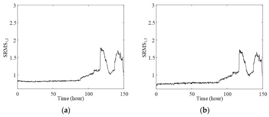 For comparing with the proposed method, the SRMSs between signals from different bearings were calculated and portrayed in Figure 10. Since the RMSs of bearings 2, 3, and 4 did not change significantly during the experimental process, , , and had similar shapes with the RMS curve of bearing 1. The irregular fluctuations of these SRMS curves, showed as Figure 10a through 10c, make it difficult to track failure evolution. In addition, the shown in Figure 10d also fails to provide clear information of failure that occurred on bearing 1.