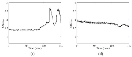 The dataset 2#, comprising four channels of vibration signals strictly collected every 10 min, was used to verify the proposed method. Corresponding to the dataset, the tested bearing ran for a total of 164 h before an outer race failure on bearing 1 was confirmed. Considering the significance of initial failure identification and serious uncertainty of failure data near the end of the experiment, the vibration signals in the first 150 h were selected to analyze the behavior of phase synchrony. The RMS indexes of the selected signals, which reflect the average power of the signal amplitudes, are given presented in Figure 9. As the failure occurred on bearing 1, the RMS of bearing 1, given in Figure 9a, dramatically increased after the 115th hour. However, the RMS decreased after approximately 6 h. Such variations cause difficulties in failure identification. As for the vibration signals of other acquisition channels, the RMS indexes just exhibited some weak increments during the experimental process. Therefore, according to Figure 9, synchronization of the RMS cannot be observed.