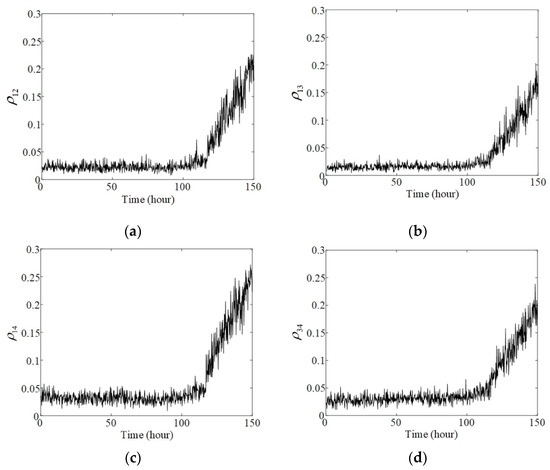 The proposed method was used to analyze the dataset. According to the spectral distribution and FCF of the outer race, the demodulation frequency band was set between 730 and 1500 Hz. The number of decomposed modes of VMD was set as three. The FIC was separated from each original signal, and four groups of phase synchronization indicators between signals from different channels at the same collecting moment, denoted as , , , and , were calculated. The results are shown in Figure 11.