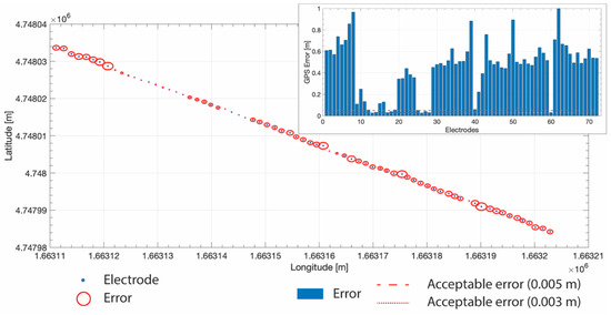 The anomalies caused by electrodes’ misplacements, as well as errors due to the topography effect, can be partially avoided thanks to the improvement of the technology. Nowadays, in fact, it is possible to measure the real/actual electrode position with a very high precision, i.e., by means of a laser distance meter [24] or by means of Differential Global Position System (DGPS) instruments [4,8,32,33,34]. Modern inversion software packages are able to take into account the real positions of electrodes [13,28,30] and, therefore, to calculate the correct geometric factor of an ERT acquisition. It is important to point out that a GPS system acquires the electrode’s position coordinates with a certain precision/error degree (in the following GPS-error) that can be set by the operator. Usually, data with a higher error are stored only if they are acceptable for the operator. These GPS-errors can be caused by: (a) a non-favorable satellite geometry, (b) the presence of some obstacles on the topographic surface (i.e., trees or mountains), or (c) low quality in the signal transmission.