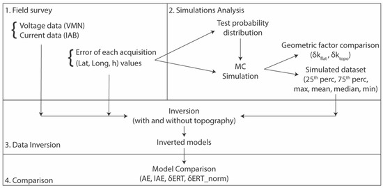 Flow chart of the whole procedure. Four main steps can be identified: 1. The field data acquisition of both electrical soil parameters (“original” data) and geographical coordinates of the electrodes, 2. The MC simulation to take into account the GPS-errors, 3. The “original” and simulated electrical resistivity data inversion with (topo) and without (flat) topography, 4. The models comparison to evaluate the GPS-error influence.