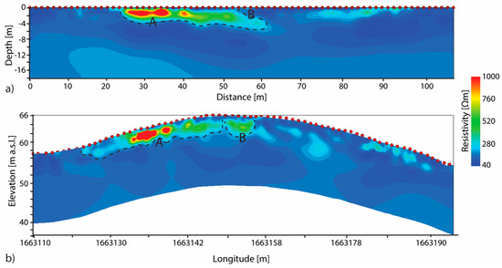 The study area is characterized by resistivity values lower than 250 Ωm (blue colours in Figure 4), typical for sandstone that, according to the geological map (Figure 1), outcrops in the area. Both flat and topo resistivity sections (Figure 4a,b, respectively), obtained inverting at the same time DD and PD acquired data, show that between 22.5 m and 60 m up to a depth of 6 m there is a high resistivity anomaly (values higher than 500 Ωm associated to green and red colours). According to the archaeologist anomaly A can be associated to the rocky blocks used to build the anthropic structures. In particular, because its elongated shape, resistivities higher than 750 Ωm can be associated to the dromos and those in the range of 300 Ωm–750 Ωm to its shadow. ERT T1, in fact, was drawn to cross the hypnotized location of the dromos. Anomaly B can be associated to the shadow of chamber filled whether with soil or air.