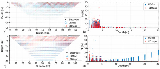 Plotting the δkflat and δktopo values against with/respect to the investigation depth for both the DD and PD arrays (Figure 6) it is possible to observe that, within the first 5 m, geometric factor distribution is influenced by the GPS-error. Moreover, the PD measurements are also affected by a greater error at a depth deeper than 7 m (Figure 6). These results are in agreement with observations of Razafindratsima and Lataste [29]. The trend of this error, in fact, is comparable to that of the error induced by considering a finite position of the remote pole instead of an infinite theoretical one. Therefore, this result confirm, as known from literature, that (a) at shallow depth, the DD array is more influenced by the GPS-error than the PD array and (b) introducing the topography in the inversion procedure, it reduces the error in depth generated by the finite position of the remote pole, that seems to have an exponential trend. It is also possible to find in the literature that the geometric error sensitivity could be used to remove measurements more sensitive to the electrode-position error [15,23]. Nevertheless, this function is quite complicate. At the contrary, the proposed parameter δk can be easily used. Considering that archaeologists are often interested in investigating the first few meters of the underground, δk can be employed to evaluate which is the GPS-error influence on the acquired dataset and to decide which quadripoles/measurements are more affected by the GPS-error and have to be removed. Given the purposes of the presented work, no measurements were removed from the datasets, and all the apparent resistivity values were taken into account in the inversion procedure.