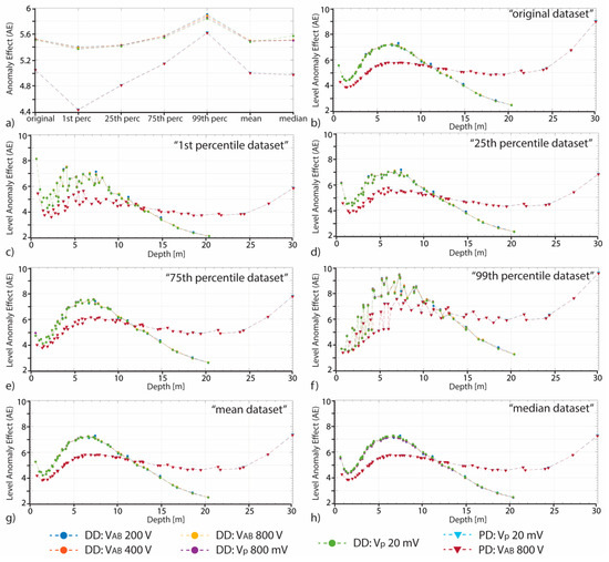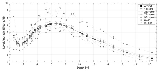 The AE and lAE values of each original and simulated dataset, calculated according to Equations (3) and (4), respectively, are shown in Figure 7 for both DD and PD arrays. It is possible to note that the DD-AE values are higher with lower spread than the PD-AE ones. Moreover, the PD-AE’s variability is higher (almost 1 point from 4.432 of the “1st percentile” dataset up to 5.629 of the “99th percentile” dataset). For both the arrays, independently of the input voltage, the AE maximum values are those of the 99th percentile datasets, while the minimum values are those of the 1st percentile datasets. The lAE values variability is higher than that of the AE. In particular, the highest values are reached by the PD-lAE at the maximum investigation depth, and in general the maximum lAE values are those of the 99th percentile dataset for both the analyzed arrays. The mean and median lAE trends are quite similar to the original one, while the others are more spreaded, especially in the first 10 m depth. The DD-lAE minimum values are reached in the last level (maximum depth of investigation), while that of the PD array are observed in the fourth level (at 1.45 and 1.97 m for the DD and PD, respectively). In general, the DD-lAE curves have a minimum at the fourth level, then increase up to the 31st level (7.3 m depth, with a tangent in the range [0.467–0.509]) reaching a relative maximum, and then decrease again quite slower (the tangent is in the range [0.353–0.373]). The PD-lAE curve trend is comparable in the first 7 m depth (the relative minimum is reached at the third level), while up to 20–25 m depth it is quite stable, and then increase faster. These results suggest that the 1st percentile and 99th percentile simulated dataset are those more affected by the GPS-error.